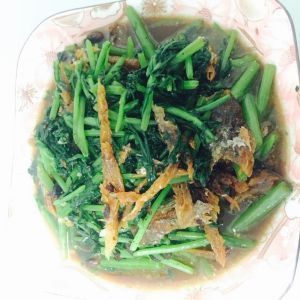 茼蒿炒熟后倒入鲮鱼,炒出香味,出锅