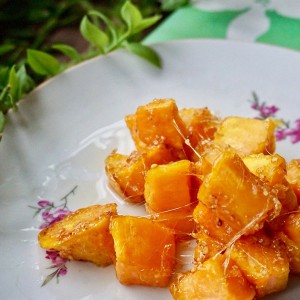 把炸好的地瓜倒入锅中,裹匀糖浆,撒上芝麻,立刻装盘,摆一小碗水即可上桌。
