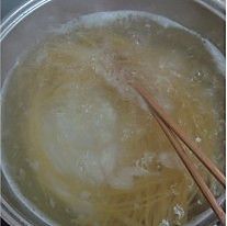 不锈钢锅里放入清水,煮开后放入1茶匙盐。然后把意粉放入煮12分钟。