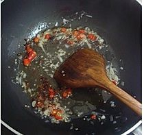 锅放油爆香大葱和指天椒。放入XO酱爆香。