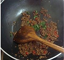 放入牛肉糜,淋入烤肉酱,炒至水份微干。放入生抽、盐继续翻炒。再放入薄菏微翻炒一会即可。