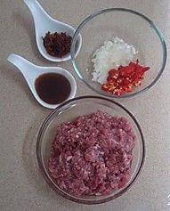 牛肉糜洗净沥干水份,大葱切碎、指天椒切圈,薄荷切碎(忘拍),XO酱、烤肉酱备好。