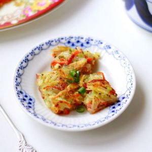 锅中倒入食用油,油热后倒入混合好的土豆蔬菜丝,盖上锅盖,小火煎。