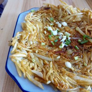 等锅里油热了后,将挤干净水的土豆放到锅里,然后加入孜然粉、麻辣鲜迅速翻炒均匀后,再把土豆薄薄铺在平底锅上用中火煎至金黄色,然后翻另一面煎黄撒上葱花即可!(如果喜欢番茄酱也可以淋上番茄酱吃喔!)