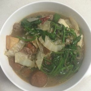 炒完加白菜炒大概三分钟左右,加热水加粉条煮5分钟加丸子