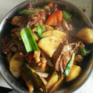 待鸡肉软烂后 放盐 加入土豆块,待土豆快熟时 放入青蒜 红绿柿子椒 大火收汁!在放入土豆时 同时另起一锅,降面饼切宽条 拉开 下锅煮熟 过凉 铺到盘底。