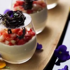 ⑩将草莓切成小丁儿,撒在提拉米苏的表面,将切成小段的巧克力网插在提拉米苏的中间,盖上巧克力圆片,放上巧克力鸟巢并弹上少许金粉装饰,即可完成