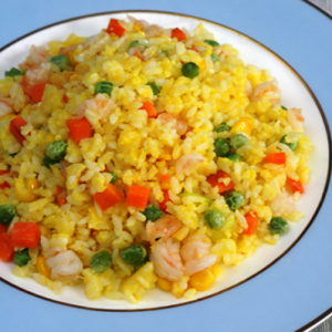 炒到米饭外面的蛋液凝固就可以了,把之前焯过水的蔬菜粒倒进去翻炒几下。