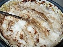 把蛋白分次加入前面的面糊里。用橡皮刮刀轻轻翻拌均匀,不要划圈搅拌以免出筋。