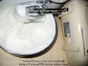 把蛋白和蛋黄分离。蛋清里加100克白糖和几滴白醋,打发备用。打到提起打蛋器,蛋白能拉出一个弯角的程度
