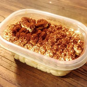 咖啡稀释,将手指饼干放入沾湿,取出铺在容器底部,挤上奶油,再上蘸湿咖啡的手指饼干,再上奶油。(若盒子还有空间可再铺一层)