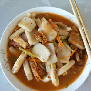 下油,热了加洋葱和蒜,炒香,放芹菜,胡萝卜丝再炒一会,放肉,最后放辣白菜翻炒,加水漠过菜, 煮开再加入年糕。