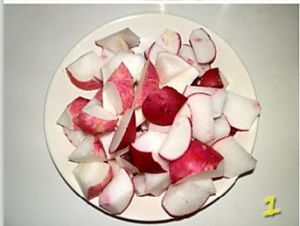 炒出香味后放入焯好的水萝卜和木耳翻炒。