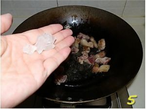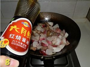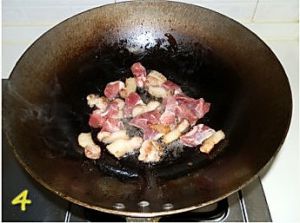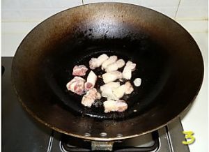 起油锅,放入少量油,放入五花肉小火煸炒,煸出多余油分,使之五花肉肥而不腻,口感更好。