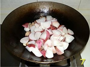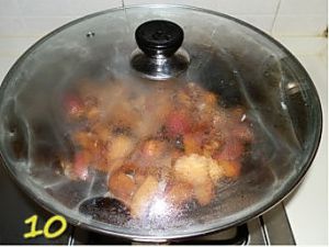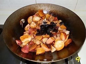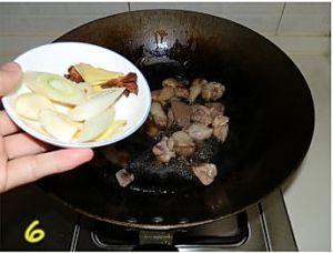 冰糖溶化后放入八角、葱姜蒜同炒。