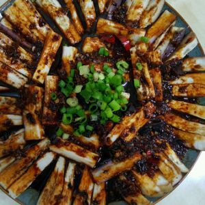 起锅,淋在蒸好的茄子上。加点香葱装饰。