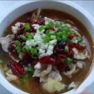 将烧至九成热的热油,均匀的浇在肉片上,一道地道的水煮肉片出锅了~~
