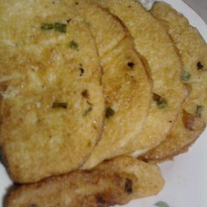 在打散的蛋液中加入盐和葱花拌匀后把馒头片放进去均匀地沾上蛋液