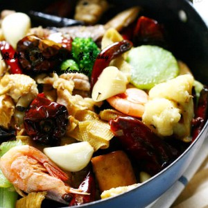 再下干辣椒、灯笼椒、郫县豆瓣酱炒香