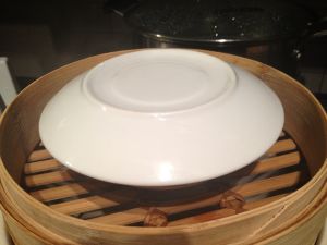 用一只大过碗口的碟子倒扣在碗上。(如果没有合适的碟子,用保鲜膜封住碗口。但我始终觉得保鲜膜不适合长时间高温蒸煮,毕竟是塑料制品)
