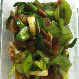 锅烧热,放一点油。然后把肉片放锅里煎一会儿,炒炒放入姜丝,花椒少量,干辣椒,炒一会儿后加入一勺郫县豆瓣酱就好。然后放入青椒和蒜苗,加一点白糖和盐,炒一会就可以出锅喽!