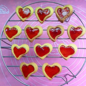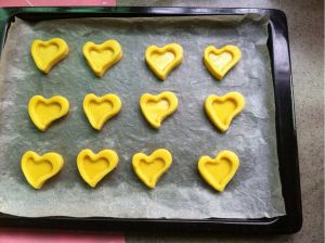 用大的心形模具压出形状 将其中一半再用小的心形压制 并掏空