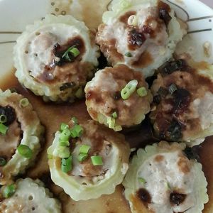 蒸熟装盘,清水加着色酱油少许,糖,盐,鸡精适量放锅煮开加入适量淀粉 出锅淋在装好盘的苦瓜上即可。