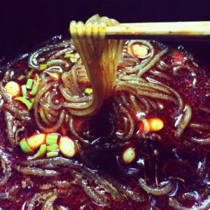 捞出粉条放在碗里,我这里的碗是一个小砂锅,放入粉条后又在砂锅里加热了一下。普通碗不加热也可以