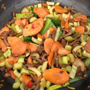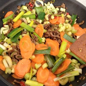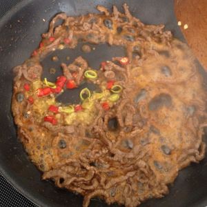 牛肉脱生了等汁略收一点后加红椒,姜蒜油泥炒香