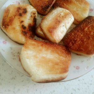 从锅边放下馒头片 小火 煎至两面焦黄 即可