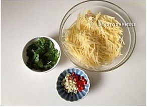 土豆去皮、擦成丝,蒜、小红辣椒切碎,香菜、葱切段;