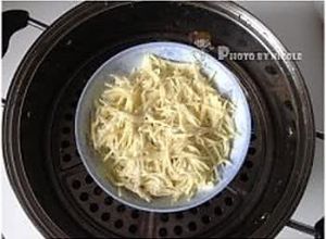 土豆丝放入盘中,锅中加水,烧开后放入土豆丝,大火蒸熟(约10分钟左右);