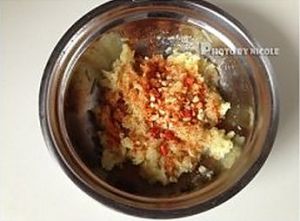 蒸熟的土豆丝放入小盆中,加入辣椒粉和蒜末、辣椒碎,充分拌匀;