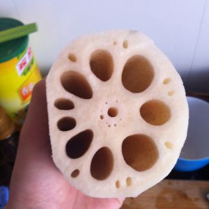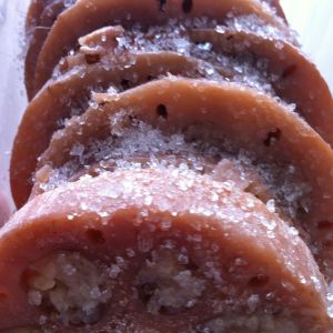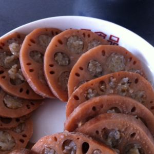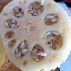 将泡一夜的糯米混合红糖、桂花、少许蜂蜜、塞入藕中筷子压紧