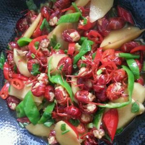 制作完成,这次是临时决定上传,所以很多步骤没有拍,那我就简单的说一下做法。 就跟平常炒菜差不多,小龙虾得用牙刷刷干净,土豆泡水,准备干辣椒 新鲜辣椒 葱蒜头生姜。热油下干辣椒再下小龙虾炒一会加料酒盐巴加点说焖煮一会,下蒜头,土豆炒一会,再下新鲜辣椒翻炒一会试下味道,再加调料下葱花,关火,差不多就这样了/呲牙