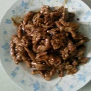 油锅内加入甜面酱、白糖、料酒,、葱姜水翻炒至粘稠后倒入肉丝