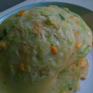 鸡蛋面粉和水搅成稀面糊,把西葫芦葱花玉米粒放进去,搅匀