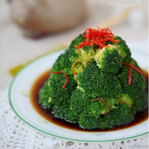 起锅做热后,放入姜丝烹香后,倒入蒸鱼豉油,烧热后放入打卷的小米辣丝后,即刻淋在码好的西蓝花上就可以享用了。