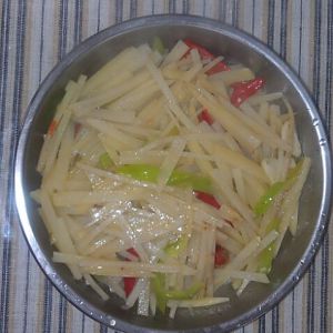 放入土豆丝,青红辣椒丝翻炒后出锅