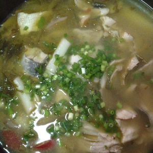 等熬上十几分钟依次往锅里放入鱼头、鱼骨、鱼片。因腌鱼时放了盐,可以等汤开后尝尝汤里有无盐再决定放不放。一般煮上十分钟鱼就好了,放入少许味精,洒上香葱就可以起锅了。