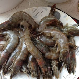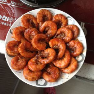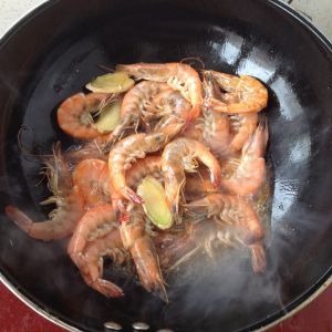 姜切片,锅内放油,待油热了放姜片、大虾,翻炒至大虾出红油虾体成红色。