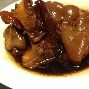 猪脚过水一遍 洗净 、放入炖锅拌炒一下 再加水满过猪脚 生抽老抽 冰糖 再加入一罐可乐炖到猪脚熟透即可,(最后可以大火收一下汁)