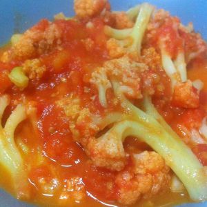 在西红柿中放入菜花,不断翻炒,让菜花充分融合西红柿的味道。出锅~~