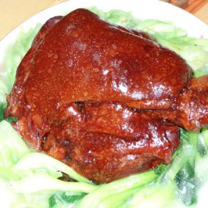 油菜心洗净,根部切十字,焯水过凉,用鸡汤调好味煨3分钟,用筷子码在肘子周围,原汤勾薄芡浇在油菜心上面。