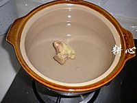 砂锅洗净,一次性放入适量的清水,放入适量的生姜。