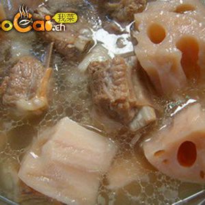 放藕和排骨一起煮。先大火,煮了5-1分钟后改小火,放腌菜(这样有点酸酸的味道)炖上20来分钟(只有筷子可以戳进藕里面就可以了)放点盐就端上桌子,撒点葱花就好啦……味道不错哦