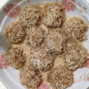 将肉馅搓成团,裹上一层糯米。糯米事先浸泡3个小时。上锅蒸熟即可~