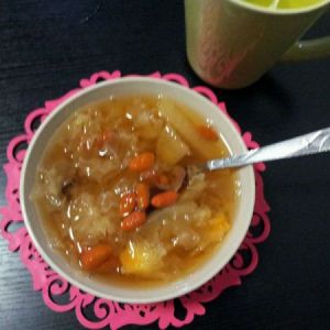 将银耳撕成小瓣放入砂锅中,加上枸杞枣肉以及凉水。熬的过程中会损失很多水,所以水一定要放足了。开大火烧开,转小火熬上一个小时,最后十分钟加入切好的雪梨以及冰糖。完工。