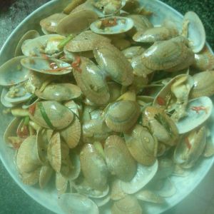 把过滤好的花蛤一起放入锅中爆炒,炒3分钟,再往里加入盐,鸡精,极美鲜,料酒再一起炒几分钟。