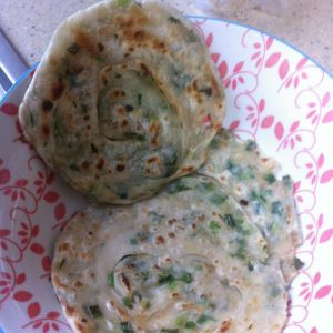 再盘成坨坨状,然后用擀面杖擀薄。过程中面皮会被葱撮破,油会漏出来,这些都不要紧的噢,忽略